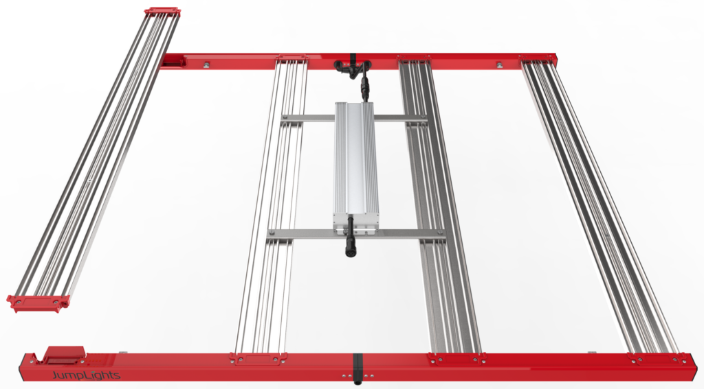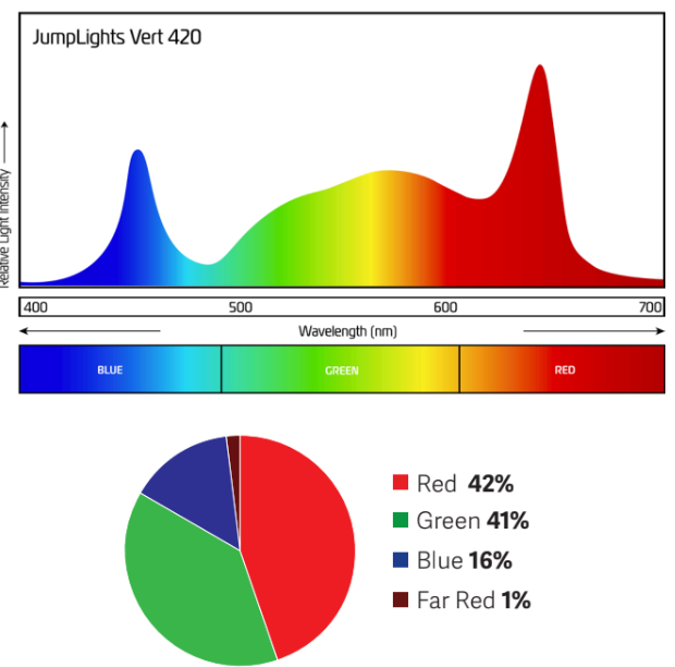 The JumpLights Vert 420 delivers 1,223 μmol/s of light output, providing powerful light in single- and multi-tier vegetative rooms. Assembled and tested in the USA with premium components, it combines strong performance with long-term reliability. Its precision spectrum promotes tight internodal spacing, strong branching, and fast canopy development, laying the groundwork for higher-yield flowering.