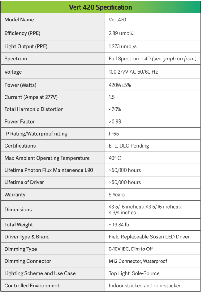 Designed for commercial efficiency, the Vert 420 features detachable Sosen drivers and individually replaceable LED bars for simple, on-site maintenance without replacing the entire fixture. Professional-grade performance at an accessible price point makes it a smart investment for growers focused on plant quality and operational efficiency.